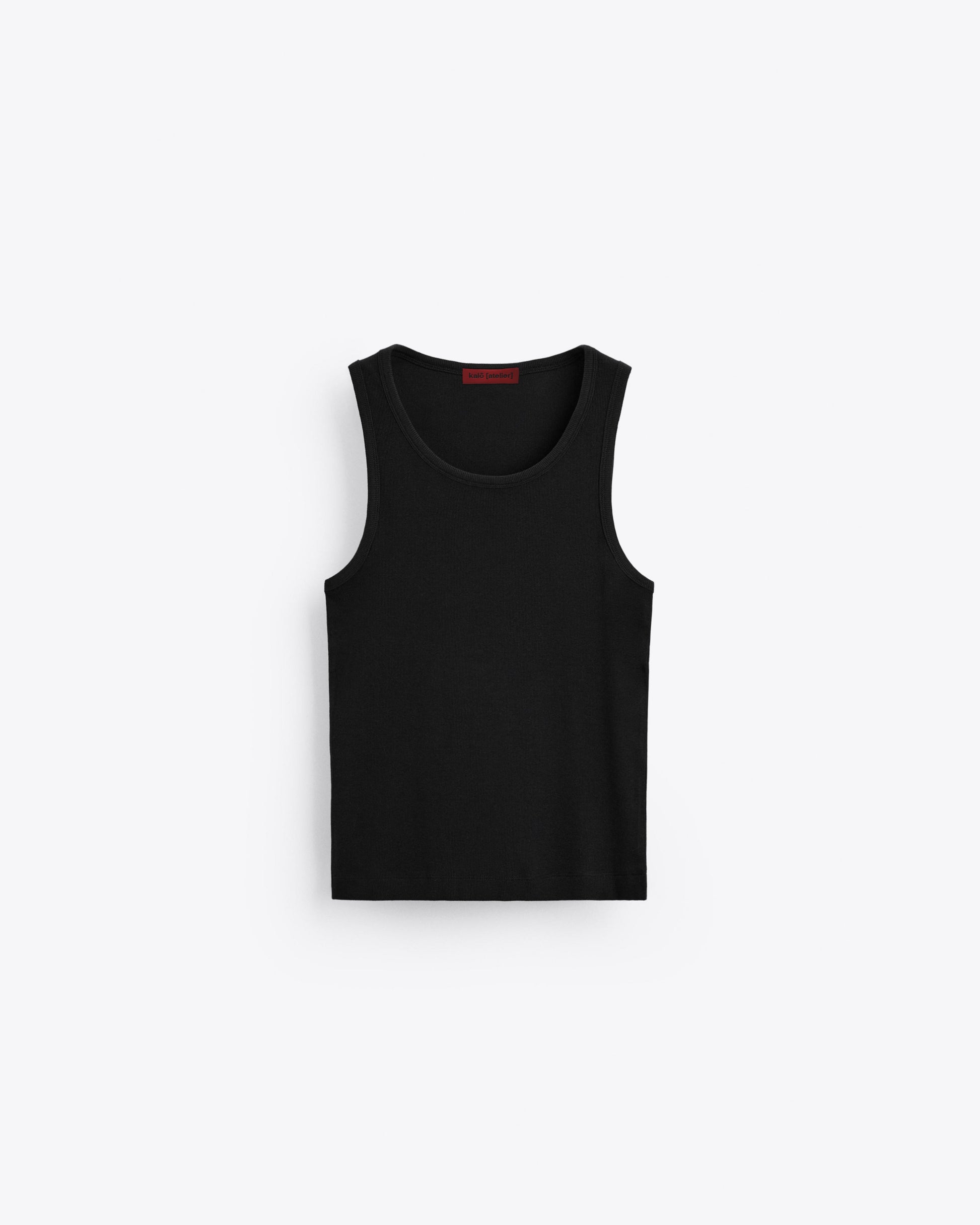DEBARDEUR CÔTELÉ AVEC ETIQUETTE ROUGE DANS LE DOS. COL ROND.