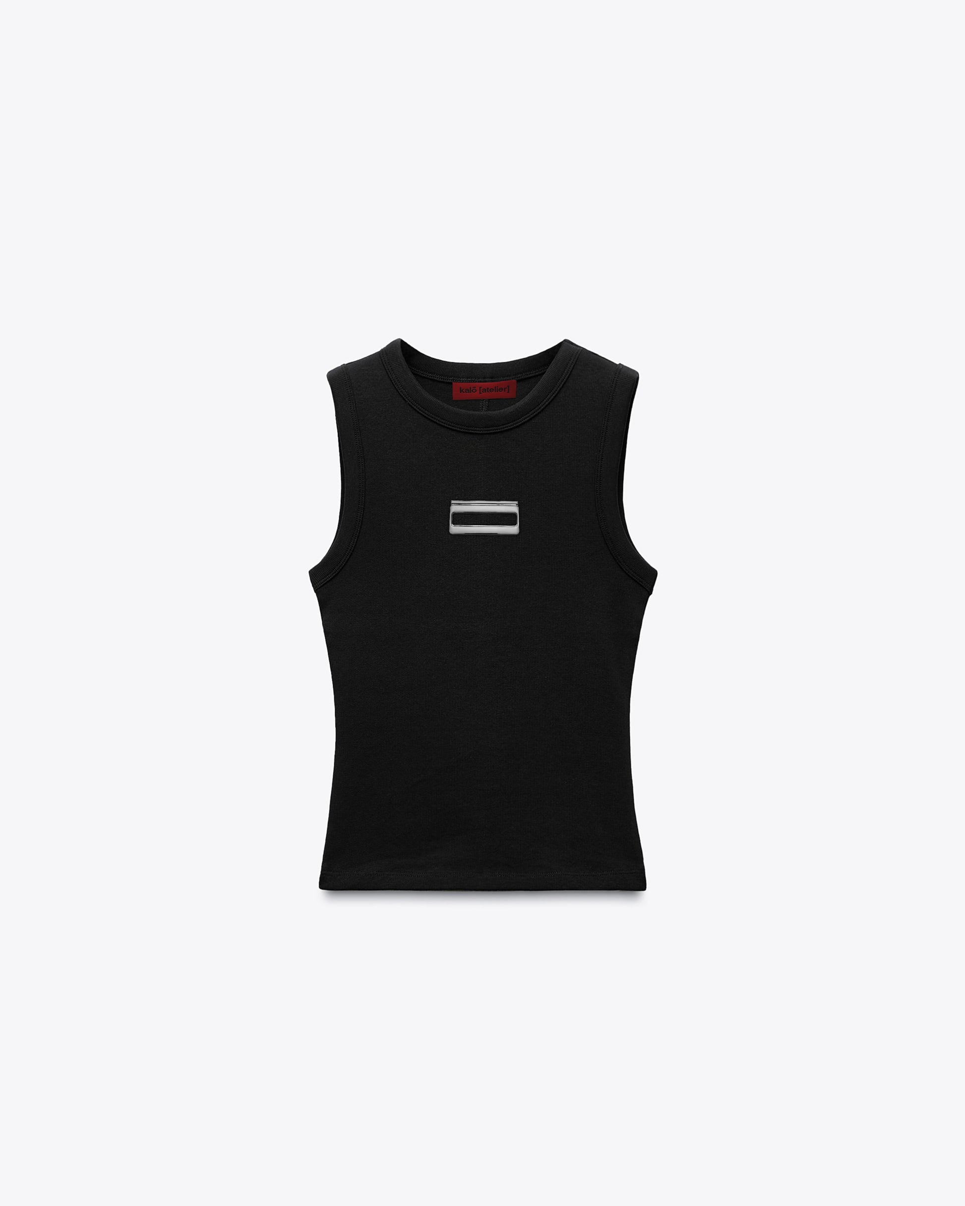 DEBARDEUR CÔTELÉ AVEC LOGO METALIQUE SUR LE TORSE ETIQUETTE ROUGE DANS LE DOS. COL ROND.